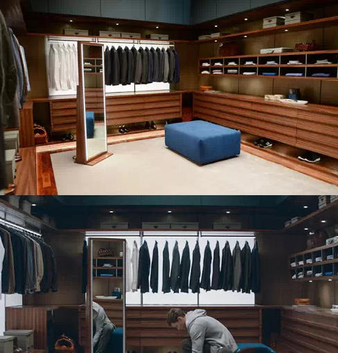 这是片头总裁的衣橱,大致分为三个区域,左边:休闲衣和休闲鞋,中间:西装和白衬衫以及皮鞋,右边:折叠好的衬衣和运动跑鞋。抽屉里包括内衣、领带、腕表、配饰、皮具等等!