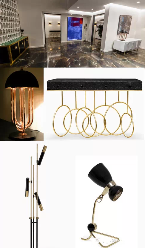 Delightfull推出的中世纪装饰主义风格灯具,包括Coltrane桌边柜灯、Ike立灯和桌灯Turner,还有中间右侧的纽约家居品牌Burlesque异型桌。