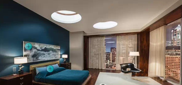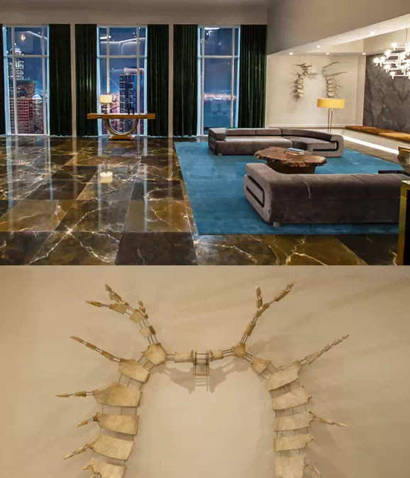 西班牙品牌KOKET’s Guilt Mirror,还有同品牌的卧室座椅、前卫的镀金壁灯和枝形吊灯