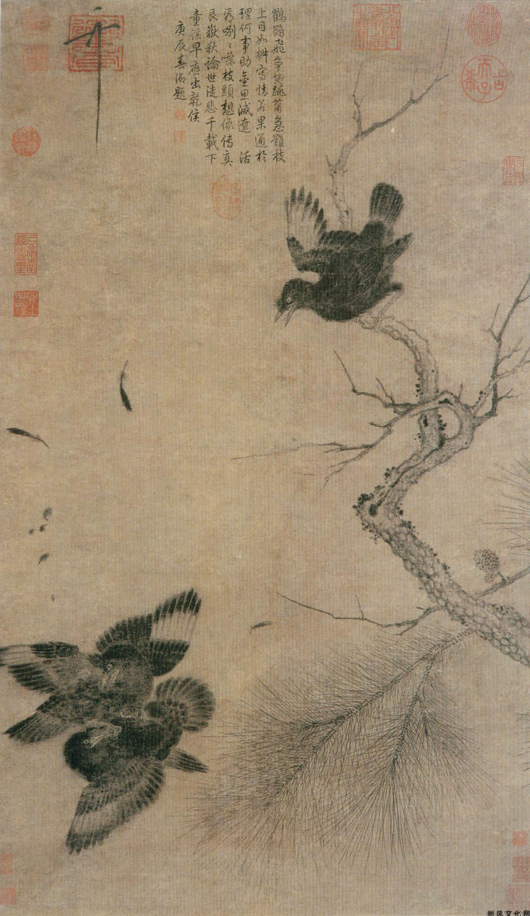 南京博物馆藏宋徽宗《鸲鹆图》写古木奇松之姿,鸲鹆相斗之趣。鸲鹆就是民间说的“八哥”,性好斗。宋徽宗赵佶笔下的三只八哥,两只正在激烈相斗,一只在一旁观战。激烈异状,博杀惨烈,啼血四溅,飞羽横尘,互不示弱,居上方一只暂获优势,下方鸲鹆力求反败为胜,奋力抗敌,情绪缴昂,鼓翅相呼,上边鸲鹆回首狠啄,伸来利爪,钩巨相拼,生死无顾,其状不可睹,令观之顿生怜悯之情。因为不论是参战者还是观战者,它们的最后结局,作品中并没有作出回答,这就给欣赏画的人留下了悬想的余地。所谓“画有尽而意无穷”的奥妙正在这里。