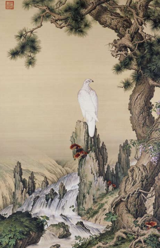 畫面:古松枝幹虯曲,松針茂密,幾塊奇石慘差錯落立於溪流中。一白鷹傲然立在高石上,回首眺望。石間或樹根處長有靈芝。松樹、靈芝均寓意吉祥、長壽之意。筆法工穩精密,設色絢麗,注重明暗變化,富有強烈立體效果,是郎世寧的巨幅佳作。
