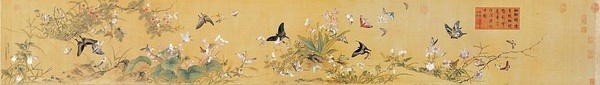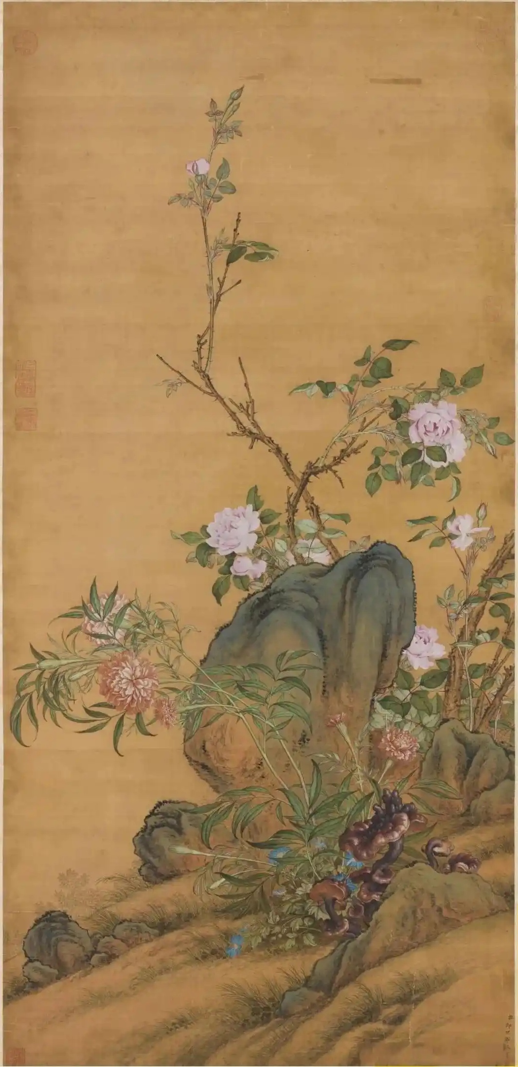 畫面:繪月季花、石竹、藍菊盛開,靈芝傍石而生,紅花綠葉生意盎然,象征健康長壽。“萬壽”爲臣民對皇帝、皇後生日的敬辭。此圖使用中國筆墨、絹、顔色,彩線兼施,花卉具有立體感,畫法富有西洋風味,但在山石上多參酌中國傳統用線勾皴的筆法。