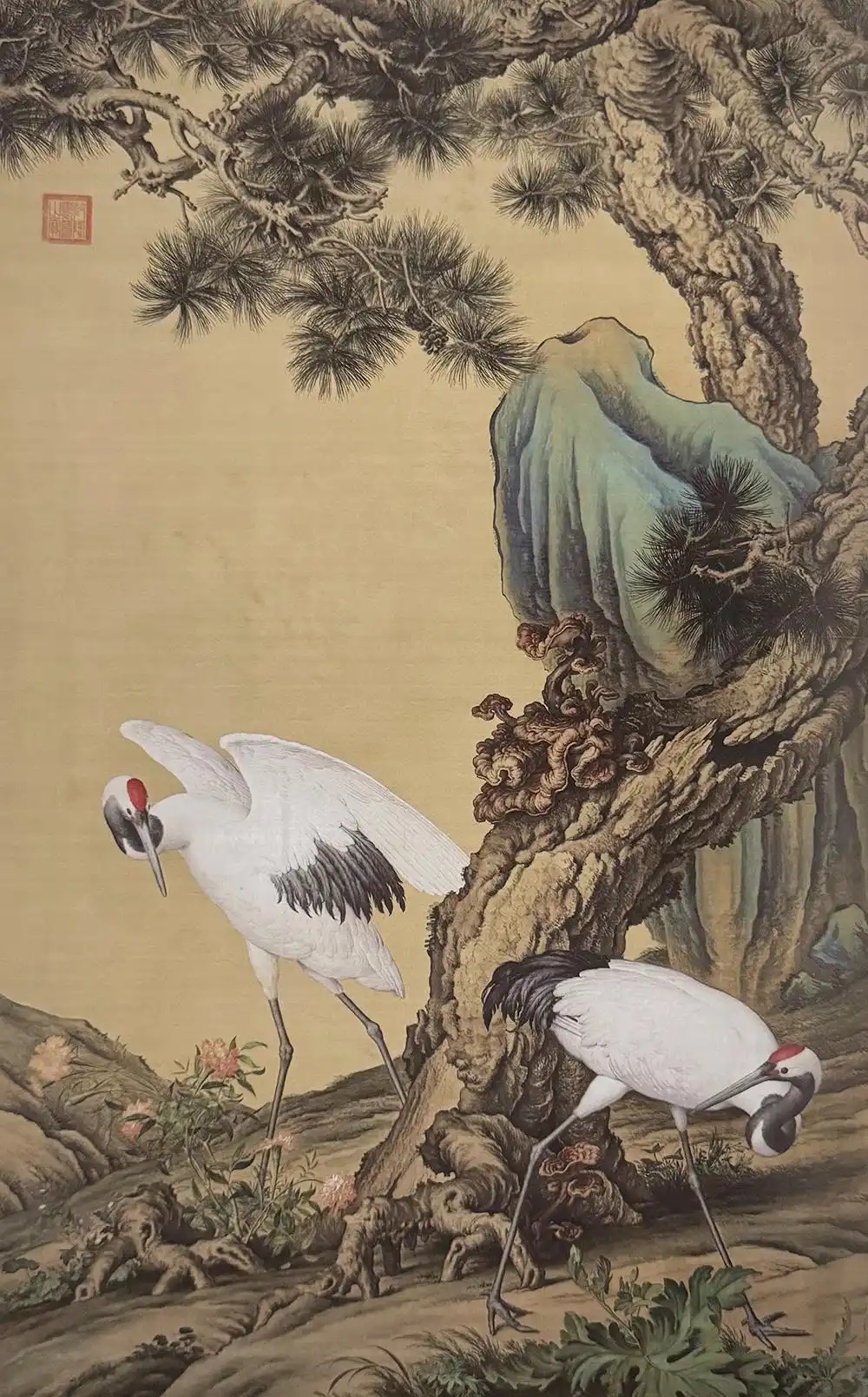 畫面:丹頂鶴,蒼松濃郁,巨石(由唐岱繪)挺立于蒼松之後,兩只鶴的形體動態極爲生動,兩只鶴似乎正在談情說愛,古松蒼勁挺拔,幹枝彎曲,松根裸露而且盤根錯節,松枝倒挂,松針狀如針刺,神態生動逼真,地面畫有各種花草,各具其態。此畫其用筆、用墨、敷色等與傳統中國繪畫有較大的差別。畫作蘊含松鶴延年,富貴長壽之美譽。