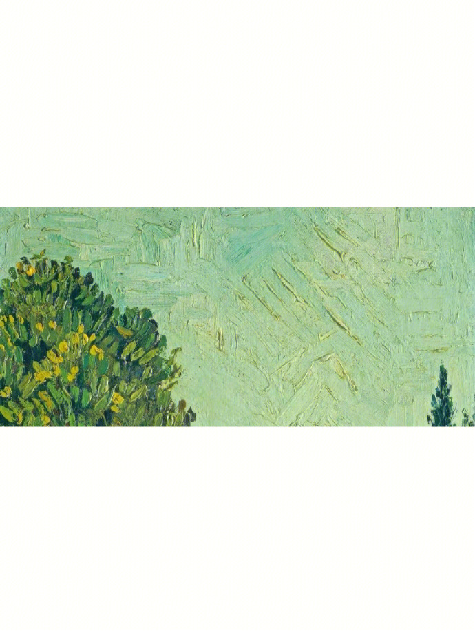 梵高融入了鲜艳的色彩与画风,创造了他独特的个人画风,梵高是个热爱自然并能从简单的事物看到纯粹之美的画家,他宁可画从窗户向外看到的树影也不画想象中的美丽幻象。梵高在1888年2月离开巴黎,来到法国南部普罗旺斯的阿尔村庄,并很快爱上了这里,阿尔勒的大自然使他疯狂,他的创作也进入了高峰。