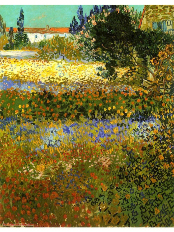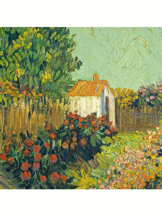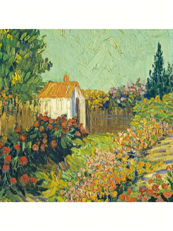 “在蓝天下,一片片橙、黄、红色的花朵显得缤纷灿烂,在清晰的空气中,这里有比北方更加欢乐、更充满爱意的东西……”1888年夏,凡·高从法国南部小城阿尔给弟弟提奥写信。在同一封信中,他提到两件不同的习作,还有一幅阿尔附近的一处花园的素描稿。那年初春,凡·高充满了对海牙画派的回忆。当他得知之前的老师安东·莫夫(Anton Mauve)逝世之后,意识到自己之前在海牙的那段时间对他是多么重要。那期间,安东·莫夫建议他要多多写生。在阿尔,凡·高尽情享受着色彩斑斓的普鲁旺斯风光。但是,在这幅画中,他的用色却与海牙画派画家的敏感细腻截然不同。
