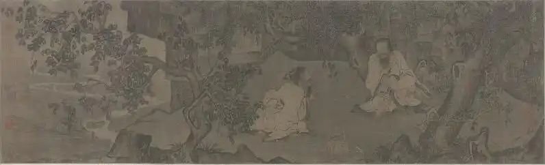 后接画心《采薇图》,背景为首阳山,拨夷和叔齐在树下对视而坐,正面抱膝者是伯夷,侧面右手撑地者是叔齐,地上有采薇用的锄头和篮子。叔齐身后是山崖边,山崖壁上有落款:“河阳李唐画伯夷叔齐”。山崖下有一条河,据史料记载首阳山位于现在甘肃渭源县,渭水经过该地,所以推断可能有泾渭分明之意。