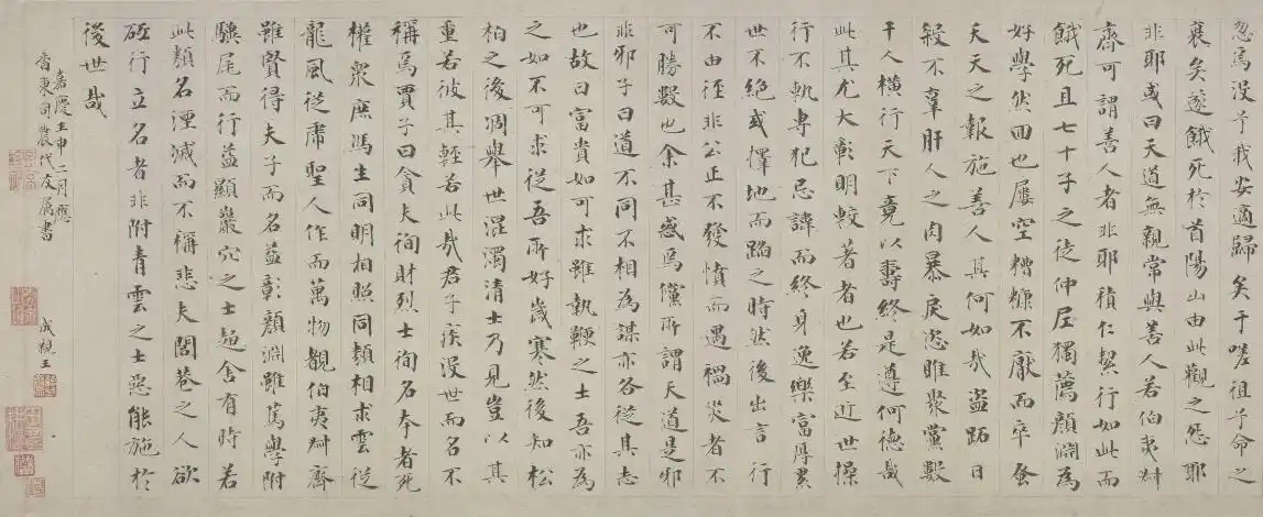 伯夷列传. 夫学者载籍极博.尤考信于六艺.诗、书虽缺.然虞、夏之文可知也.尧将逊位.让于虞舜.舜、禹之间.岳牧咸荐.乃试之于位.典职数十年.功用既兴.然后授政.示天下重器.王者大统.传天下若斯之难也.而说者曰:尧让天下于许由.许由不受.耻之逃隐.及夏之时.有卞随、务光者.此何以称焉?太史公曰:余登箕山.其上盖有许由冢云.孔子序列古之仁圣贤人.如吴泰伯、伯夷之伦详矣.余以所闻.由、光义至高.其文辞不少概见.何哉.孔子曰:伯夷、叔齐.不念旧恶.怨是用希.求仁得仁.又何怨乎.余悲伯夷之意.睹轶诗可异焉.其传曰:伯夷、叔齐.孤竹君之二子也.父欲立叔齐.及父卒.叔齐让伯夷.伯夷曰:父命也。遂逃去.叔齐亦不肯立而逃之.国人立其中子.于是伯夷、叔齐闻西伯昌善养老..盍往归焉.及至.西伯卒.武王载木主.号为文王.东伐纣.伯夷、叔齐叩马而谏曰:父死不葬.爰及干戈.可谓孝乎.以臣弑君.可谓仁乎.左右欲兵之.太公曰:此义人也.扶而去之.武王已平殷乱.天下宗周.而伯夷、叔齐耻之.义不食周粟.隐于首阳山.采薇而食之.及饿且死.作歌.其辞曰:登彼西山兮.采其薇矣.以暴易暴兮.不知其非矣.神农、虞、夏忽焉没兮.我安适归矣.于嗟徂兮.命之衰矣.遂饿死于首阳山.由此观之.怨邪非邪.或曰:天道无亲.常与善人.若伯夷、叔齐.可谓善人者非邪.积仁洁行.如此而饿死.且七十子之徒.仲尼独荐颜渊为好学.然回也屡空.糟糠不厌.而卒蚤夭.天之报施善人.其何如哉.盗跖日杀不辜.肝人之肉.暴戾恣睢.聚党数千人.横行天下.竟以寿终.是遵何德哉.此其尤大彰明较著者也.若至近世.操行不轨.事犯忌讳.而终身逸乐.富厚累世不绝.或择地而蹈之.时然后出言.行不由径.非公正不发愤.而遇祸灾者.不可胜数也.余甚惑焉.倘所谓天道.是邪非邪.子曰:道不同.不相为谋.亦各从其志也.故曰:富贵如可求.虽执鞭之士.吾亦为之.如不可求.从吾所好.岁寒.然后知松柏之后凋.举世混浊.清士乃见.岂以其重若彼.其轻若此哉.君子疾没世而名不称焉.贾子曰:贪夫徇财.烈士徇名.夸者死权.众庶冯生.同明相照.同类相求.云从龙.风从虎.圣人作而万物睹.伯夷、叔齐虽贤.得夫子而名益彰.颜渊虽笃学.附骥尾而行益显.岩穴之士.趋舍有时.若此类名湮灭而不称.悲夫.闾巷之人.欲砥行立名者.非附青云之士.恶能施于后世哉.嘉庆壬申二月应香东司农代友属书.成亲王.钤印:诒晋斋