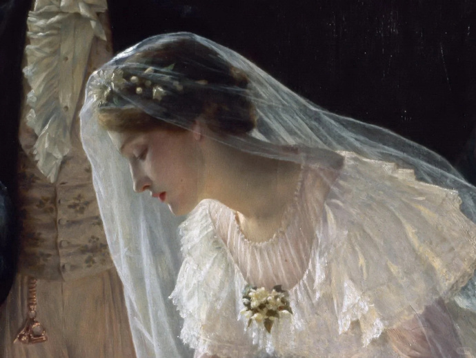 英国著名画家埃德蒙·布莱尔·莱顿创作于1920年的一幅布面油画作品,描绘了一对新人结婚时的情景。一位美丽的新娘身穿一身洁白的婚纱,胸口戴着一朵白色的花朵,头上戴着花环和披着白丝巾,弯着腰一只手拿着羽毛笔在一本大书上签字,另一只手按着书的一角。新郎手拿礼帽站在新娘旁边,聚精会神地看着新娘签字,新娘身后是一个手捧白色花束的小花童和来参加婚礼的人们,新娘对面是一位主持婚礼的老者。整幅画都散发着古典优雅的气质。