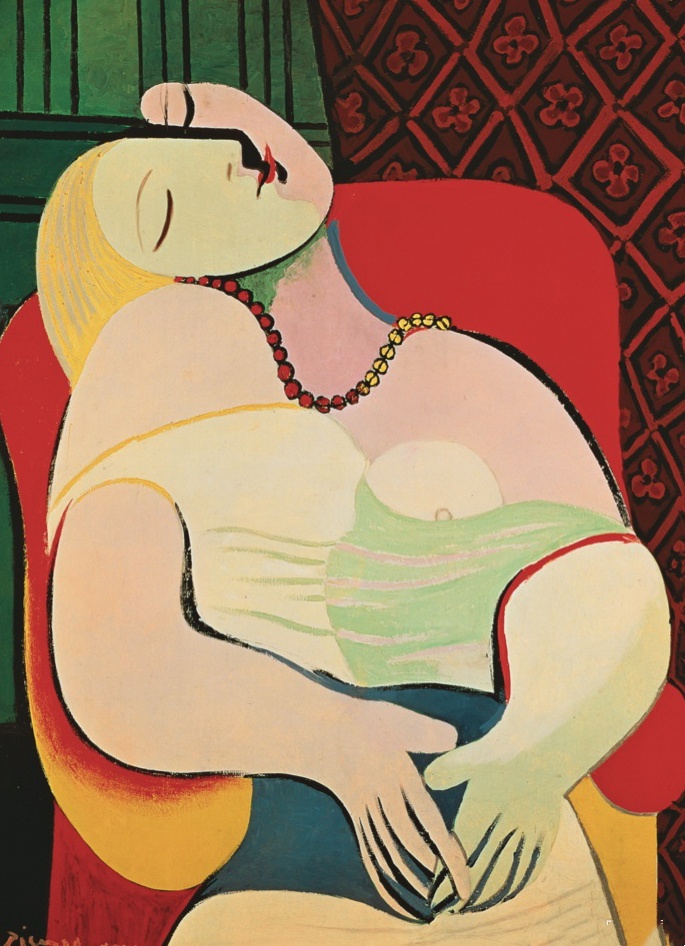 这幅画作于1932年,可以说是毕加索对精神与肉体的爱的最完美的体现。《梦》又称《在红色安乐椅上睡着的女人》,只用线条轮廓勾画女人体,并置于一块红色背景前。女人肢体没有作更大分解,稍稍做了夸张划分,色彩也极其单纯。这幅画是毕加索以立体派描绘女人形象和新古典派风格相结合的产物,是形象极端自由——线条和色彩自由组合的杰作。