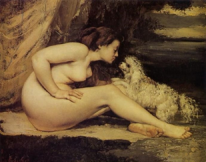 这幅画中女主角的脸孔和躯体皆比不上传统公认的标准美人,维纳斯。库尔贝是以他的朋友莱奥婷·雷诺为模特儿。库尔贝用自己的方式诠释女性气息,长得匀称具备农村女人的结实打破传统浪漫主义审美观,他执意为存在的对象找寻最完美的存在表现,而不是幻想堆砌浪漫。画面上,纹理清晰的岩石,不远处快隐匿的光线,一圈一圈往上堆积奔涌的潮水,在灰暗的冷色调中,坐著一个肥胖裸女,她正在逗弄狮子狗,她的左手挽著牠毛茸茸融的背,獗著嘴迎接狗儿的亲吻。