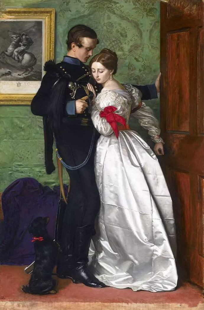 画中身穿黑衣的军官在1815年的滑铁卢战役前夜与情人告别。他是一位德国的骑兵,将与英军一起同拿破仑的军队作战。年轻女子深知拿破仑的力量,因此她紧握住门把手,试图阻止很可能永别的爱人走出房门。