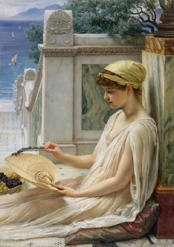 这是一幅唯美的作品,展现了一个妙龄女子在阳台上手拿扇子出神的情形。波因特是英国拉斐尔前派画家,1870年以后他开始走古典主义创作道路,善于描绘年少青春女性。他担任过皇家美院院长和伦敦美术馆长。