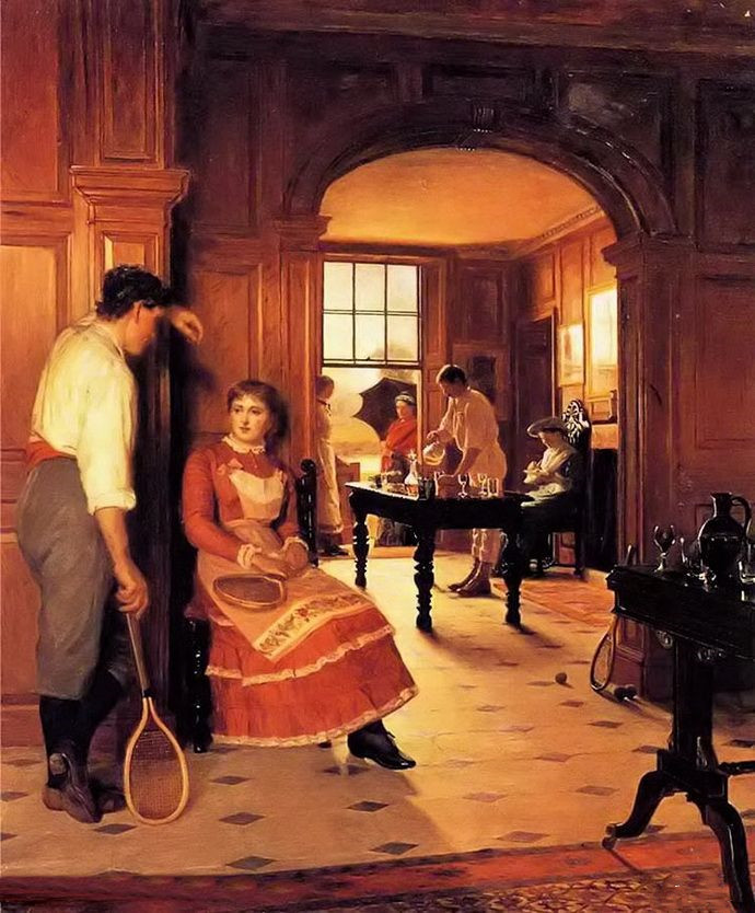 这里描绘的是一个中产阶级家庭闲适而平静的家居生活。室外、室内的人们都因阵雨而转入新的话题,室内近景的青年男女因阵雨而停止了打网球活动,随意闲谈着;门厅里,一老妇坐着喝咖啡,白衣青年正在倒水;门外的人们在悠闲地聊天。三组人物,三个空间,统一于一个画面之中,没有明确的主题,只是表现了家居的宁静与安乐。