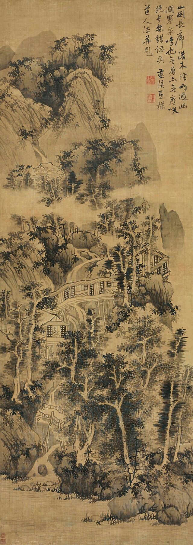 蓝瑛《仿吴道人山水图》立轴,尺寸 167.5×59.2cm。款识:山阁长廊灌木阴,雨过幽涧寒泉鸣,也无暑亦无尘,笑绝长安错认真。蓝瑛画楳道人法并题。钤印:蓝瑛之印、田叔父。鉴藏印:文昭、汪仕周印。