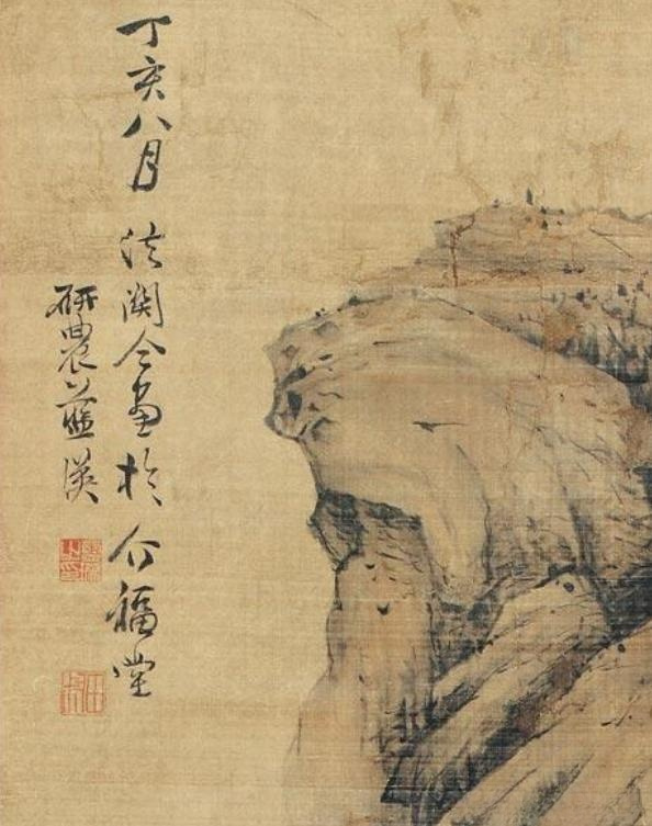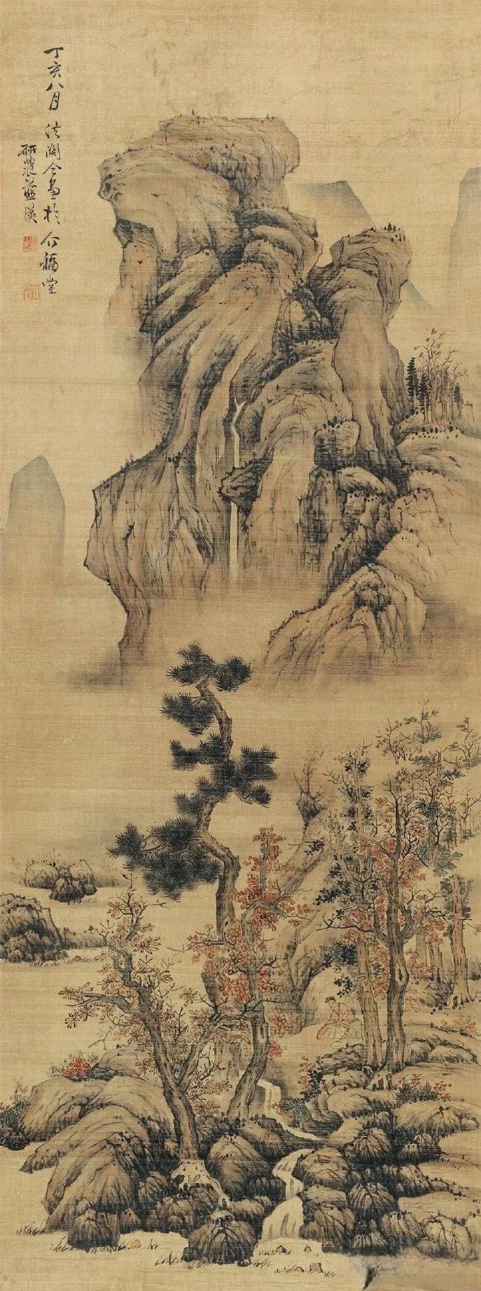 蓝瑛《仿关仝山水》立軸,尺寸 168×62cm,款识:丁亥八月法关仝画于介福堂,研农蓝瑛。钤印:蓝瑛之印、田叔。是蓝瑛1647年的山水作品,时年画家62岁。