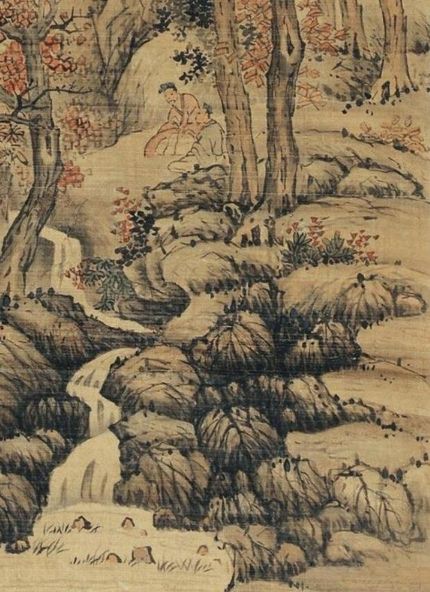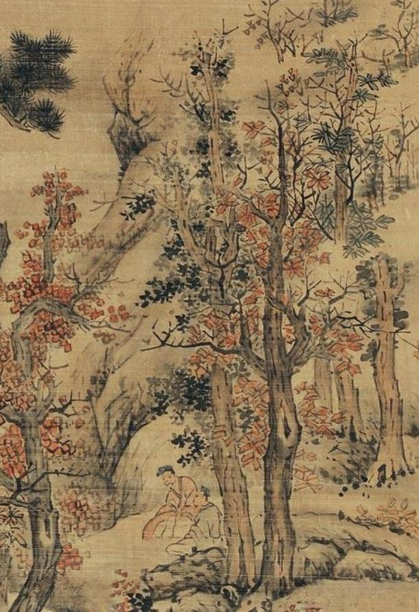 此画,描绘的内容是远景处的山峰与近景处的树林,山峰虽处于远景,但在整体布局面积上占了整个画面的二分之一。气势堂堂,巍然矗立,并有迷朦幽深意境。细看其间有瀑留出,顺势而下一片茫茫。树林之中松柏青绿,挺拔屹立,居于画中,向上伸展的趋势可与远处山峰遥相呼应。其它树木枝叶泛红,染点其间,为这秋日的山林树石带来点点生机。嶙峋怪石中溪水缓缓流出,恬静舒畅,让人不禁联想其源头急瀑,可谓远矣。如此美景怎能不引人入胜,树林中两位贤士倚树傍水,或谈、或听、或观、或冥,置身其中,优游世外。诚如题识所云,在此画作中可知为仿五代著名山水画家关仝(公元10世纪)的绘画特征,秋山寒林,巨峰屹立,山峰比例大而具体积感,但并不失稳定。同时,蓝瑛引入自己南派山水的青绿画法,运用青绿、朱砂等矿物颜料,使得画面工细且色彩鲜艳明快。从题识上看该作品“法关仝”之说,也只是蓝瑛在自己作品的题款中经常出现的一种方式,“仿某某家之作”,其实所画内容均是自己的创作。
