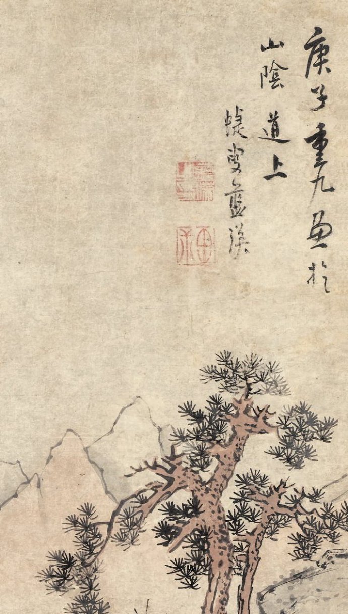 蓝瑛《秋山清话图》,立轴,设色纸本,尺寸:148.5×81.5 cm,约10.9平尺。庚子(1660年)年作。题识:庚子重九,画于山阴道上。蜨叟蓝瑛。钤印:蓝瑛之印、田叔。