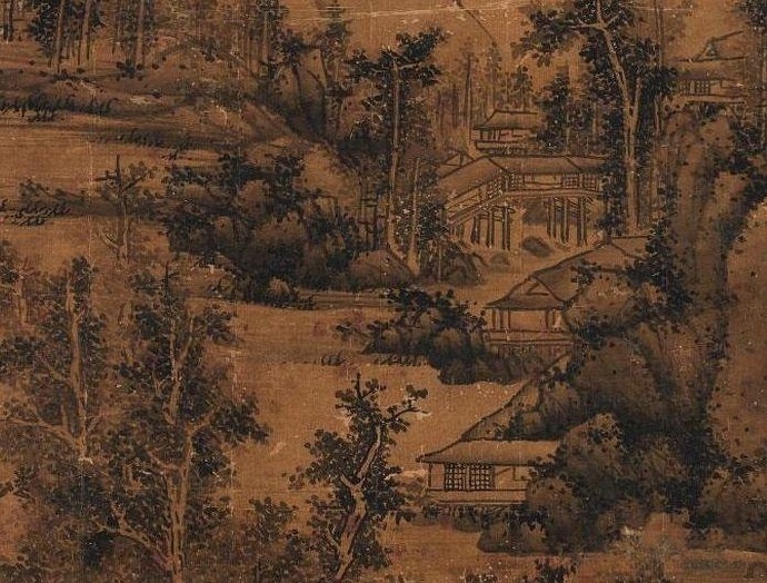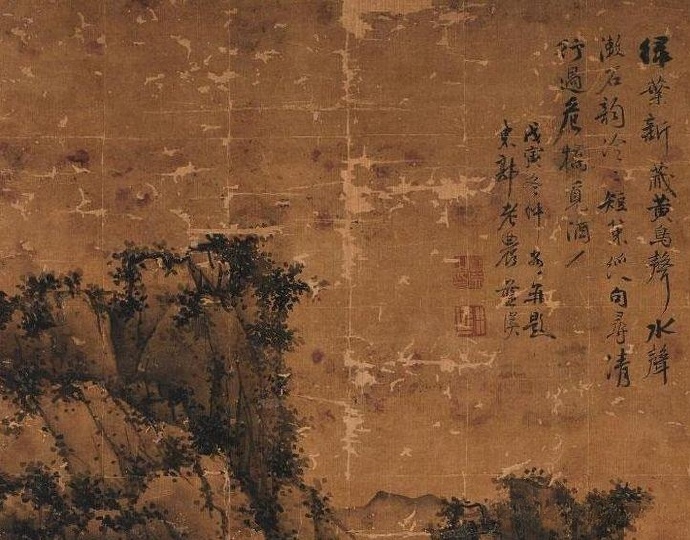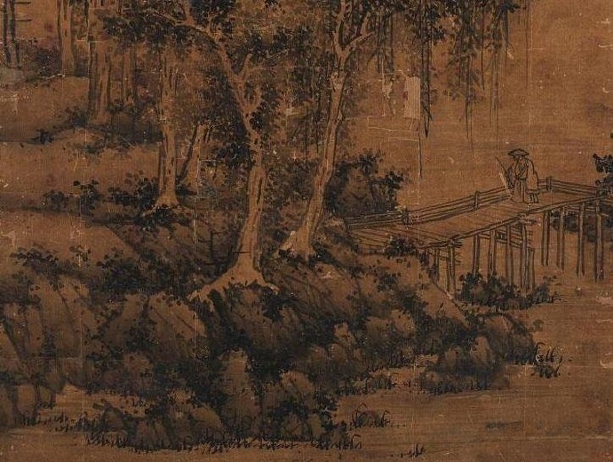 蓝瑛《缓杖觅酒图》,尺寸:159.5×57cm。款识:绿叶新藏黄鸟声,水声漱石韵冷冷。短策缓句寻清,行过危桥觅酒人。戊寅(1638)冬仲画并题,东郭老农蓝瑛。钤印:蓝瑛之印、田叔父。鉴藏印:翁鉴藏印。