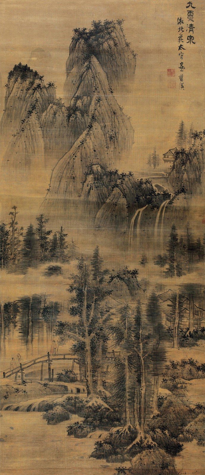 蓝瑛《九夔清泉》立轴,设色绢本。尺寸 225×96.5cm,款识:九夔清泉,仿北苑太守画,蓝瑛。钤印:蓝瑛之印、田叔。收藏印:语石斋藏书画。 此作画面以遒劲的笔墨营造一种苍茫雄奇、高古豪迈的意境。画中云霭缭绕、泉瀑清流间隐士怡然自得,仿佛桃源仙境。山石的轮廓线苍劲、灵动,以破笔点苔,以侧锋皴擦,气象嶒峻;山中杂以树木房石,在整齐有序中见笔力苍劲老练。画上题款用笔苍劲而流畅,与绘画风格融为一体。此画反映了蓝瑛深厚的笔墨功底和高超的绘画技巧,是其从中年博取众家之长以后,逐渐走向成熟时期之作,为其中晚年时佳作。