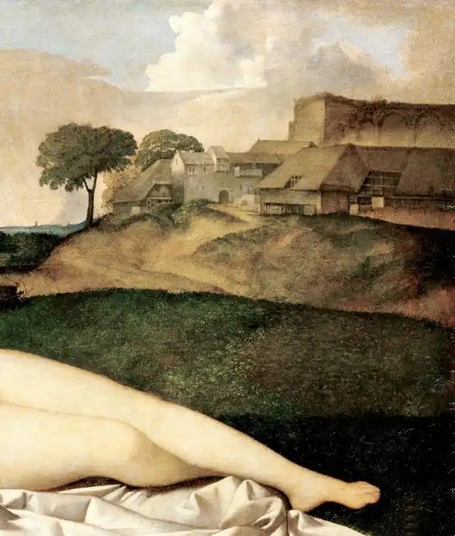 乔尔乔内的几幅有关美女的伟大作品都涉及与另一位大师——提香的合作。这幅作品就是与提香合作完成的,尤其是画中的风景。维纳斯伸展躯体的部分是由乔尔乔内绘制的。维纳斯白晳的肉体与柔滑丝绸布料形成对比,与大自然互为呼应。这种艺术处理不是为了给人以肉感的官能刺激,而是为了展现女性具有生命力的肉体和纯洁心灵之间的完美统一。这种充满人文精神的美的创造,是符合文艺复兴时期理想“美”的典范的。画家对晕涂法的运用模糊了人物轮廓的界线,但是边缘却是清晰的,画面的明暗对比分明。乔尔乔内充分发挥了油料和题材的潜在效果。
