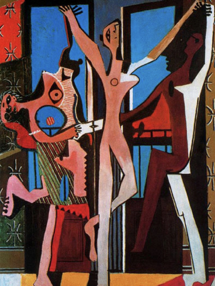 巴勃罗·迭戈·何塞·弗朗西斯科·狄·保拉·胡安·纳波穆西诺·玛莉亚·狄·洛斯·雷梅迪奥斯·西普里亚诺·狄·拉·圣地西玛·特里尼达·路易斯·毕加索(1881.10.25-1973.4.8),西班牙画家、雕塑家,立体画派创始人,20世纪现代艺术的主要代表人物之一。《三个舞者》是毕加索对人体解构的开始。超现实主义的追捧使毕加索更强化了对人的潜意识的表现。三个纤细的舞女正在狂舞,中间的舞女张开双臂,扬起头,挺着胸,像十字架一般,左边的舞女则头向后仰,而右边的人则像一个男人的侧面,钉子般纤细的手正拉着对面女人的手不停旋转。被欲火与死亡蛊惑的舞女疯狂地扭动自己畸形的身体,透出一种撕心裂肺的极端情绪。“他憎恨一切,同时也接受一切。毕加索并非其人本身,他在创造自己。”圣贝诺瓦给考克托写的一封长信中说到。