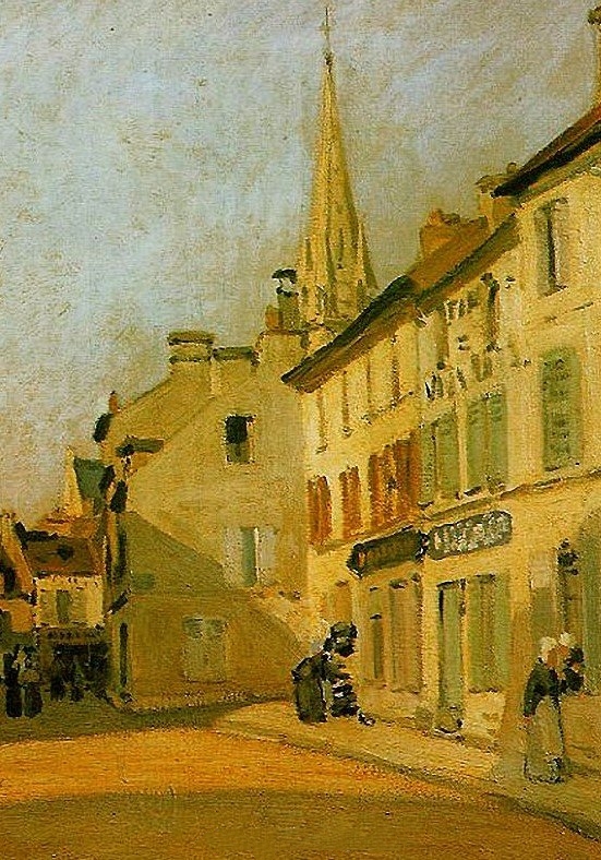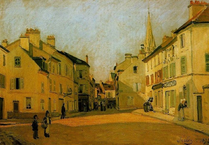 如果把这幅画同莫奈、毕沙罗的一些比它早的作品加以比较,惹人注目的不仅是西斯莱的绘画更富有稳定性和自然性,而且还有他得自柯罗的那种独特手法。农村小景对于西斯莱说来,不是用以创造明暗对比的依据,也不是生活的题材,而是色彩之间的相互关系。这些色彩是那么的丰富、强烈和斑杂。黄色、玫瑰色和绿色强调了房屋的灰调子,棕色又强调了土地的色调。房顶有的呈棕色,有的呈深蓝色,它们被明亮的粉蓝色的天空所衬托。