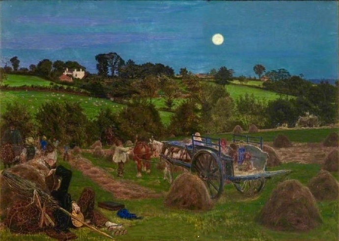 福特·马多克斯·布朗(1821.4.16-1893.10.6),英国画家、设计师。布朗与其妻子和他们的一个女儿在夜间散步:“这个夜晚多么美妙,看那干草地,未曾收割的草,还有犁沟和灌木丛中未曾被破坏的干草的灰绿色,可爱的蓝紫色和硕长的树影斜横在地里,斑驳无比,在瞬间相互交融,云朵过处,如梦如幻。”于是绘制了《干草地》这幅画。这幅画作把艺术家象征成自然界的观察者。正如农夫与他的劳工一样,艺术家也在地里辛勤地工作了一天。我们欣赏到暮色渐浓的黄昏美,以及在人们一天的辛劳后在干草地上挥洒光辉的明月。