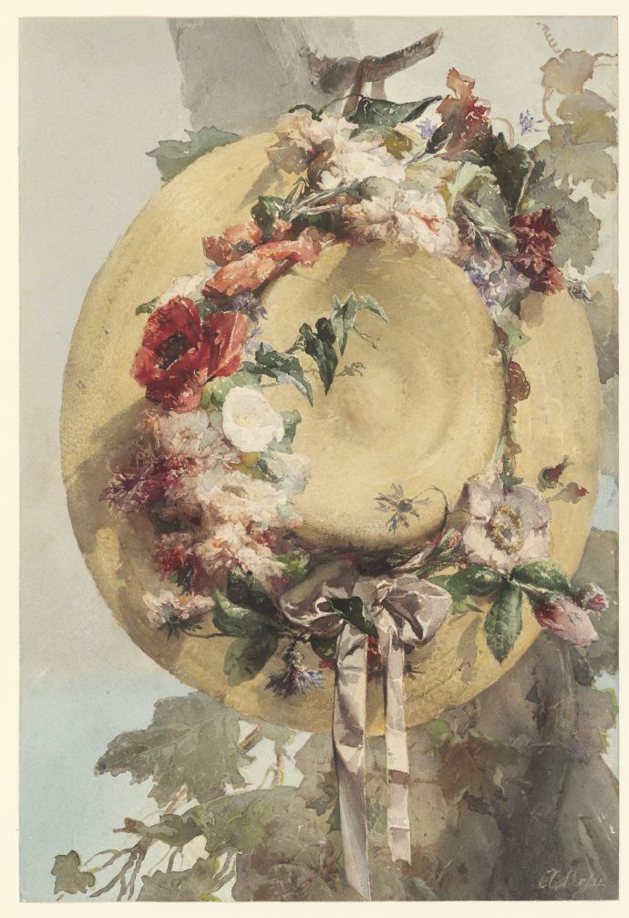 画作名称: Strooien hoed met roos, anjer en korenbloem