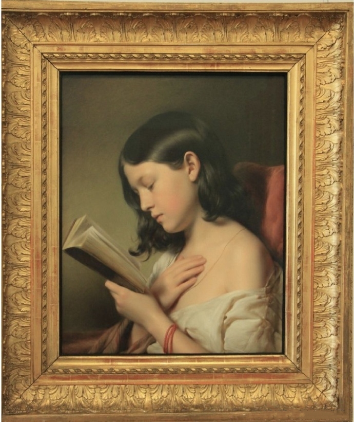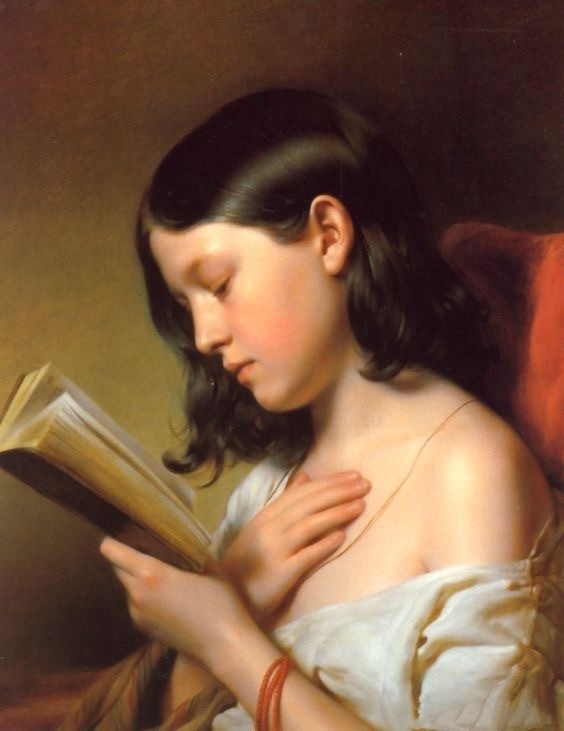 年轻的女孩正全神贯注地沉浸在故事里,一侧的衣服已从肩膀滑下来,但她并未察觉。她的右手压在胸口上,正读的内容让她屏住呼吸。而她的情绪波动似乎也影响到手中的书,那些书页不是平整地合在一起,而是迎着光线微微散开