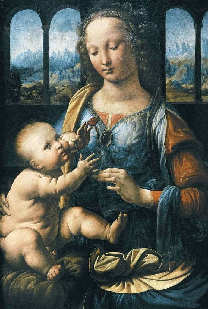 这幅《持康乃馨的圣母》是达芬奇于15世纪创作的一幅油画作品。圣母穿着暗蓝色的衣服,外加红袖红裙,身披金色的斗篷,胸前别了一只胸针。圣母将圣婴抱在怀里,她一手扶着他,一手则拿着一朵康乃馨。圣婴正伸出手想要抓住康乃馨。此画前景中摆着一瓶花,圣母的肘部几乎就要碰到花瓶。萨瓦里笃定该画是达芬奇跟韦罗基奥学徒时期的作品,画中的圣母带有韦罗基奥作坊的特点 苍白的、北欧人式的脸,金黄色的卷发,双眼望着下方。能反映达芬奇特色的地方是圣母身后穿过凉廊的风景,那是一排崎岖不平,犬牙交错的山峰。