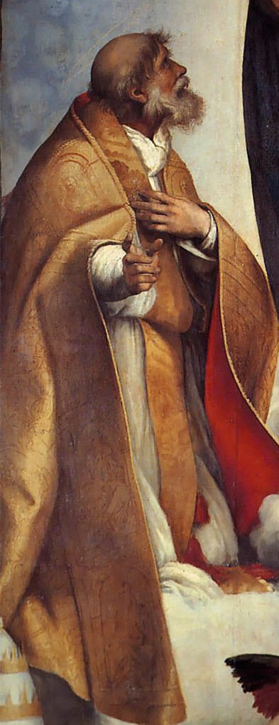 画面表现圣母抱着圣子从云端降下,两边帷幕旁画有一男一女,身穿金色锦袍的男性长者乃教皇西斯克特,他向圣母圣子做出欢迎的姿态。而稍作跪状的年轻女子乃圣母的信徒渥娃拉,她虔心垂目,侧脸低头,微露羞怯,表示了对圣母圣子的崇敬和恭顺。