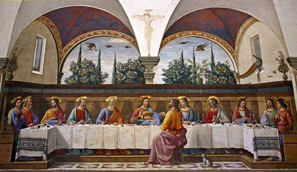 多梅尼哥·吉兰达约《最后的晚餐》(1480年,湿壁画,400 × 810 cm,佛罗伦萨奥尼桑蒂修道院食堂)