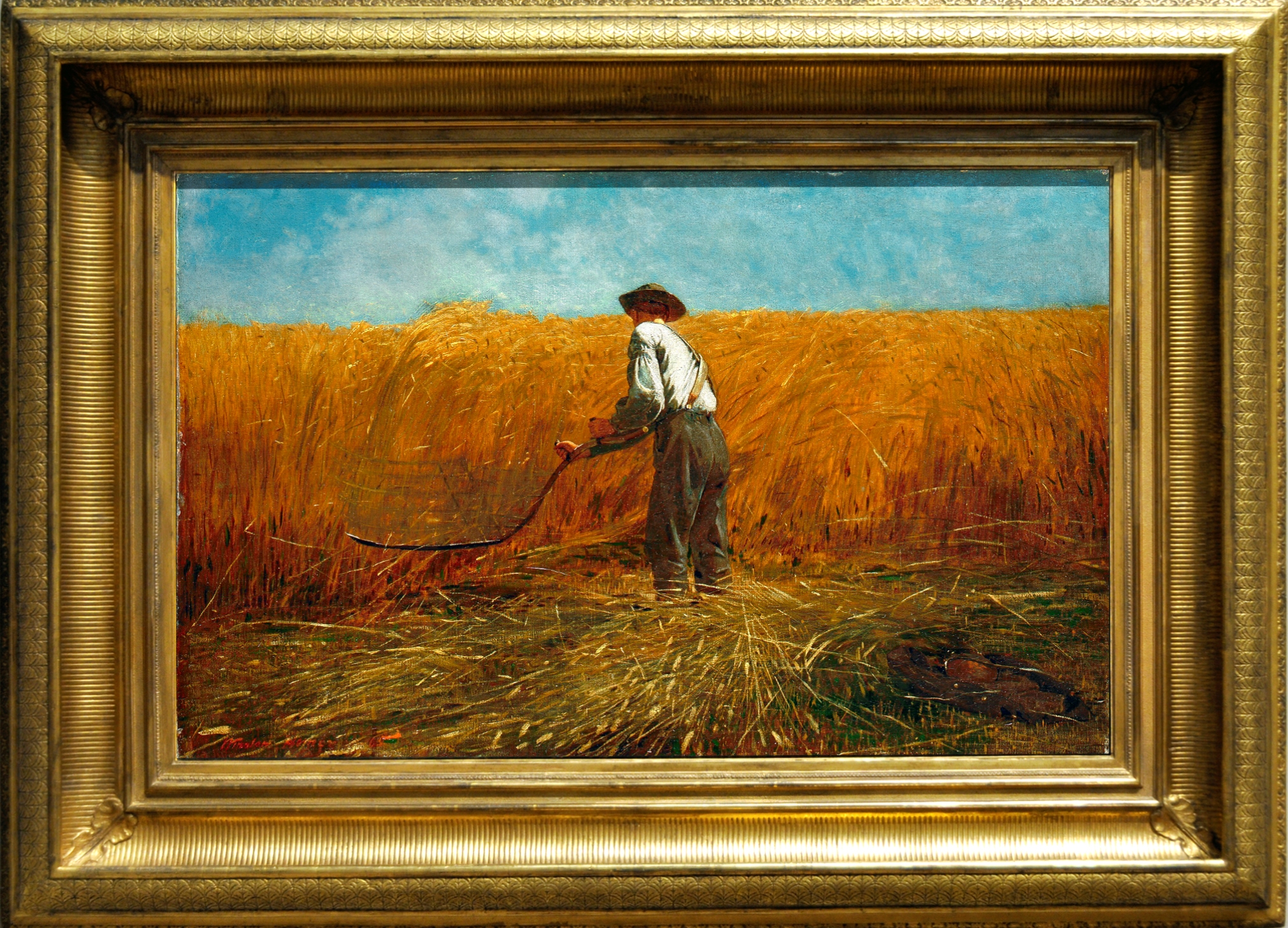 画家在这幅画上从另一个视角来审视战争。1865年南军的李将军投降后,北方联军就开始遣返士兵。这个退伍士兵在自家的田里收割麦子,这是他的新战场。霍默曾作为一家纽约期刊的插图画家上过前线,对战争有切身的体验,画中他对和平的渴望溢于笔端。
