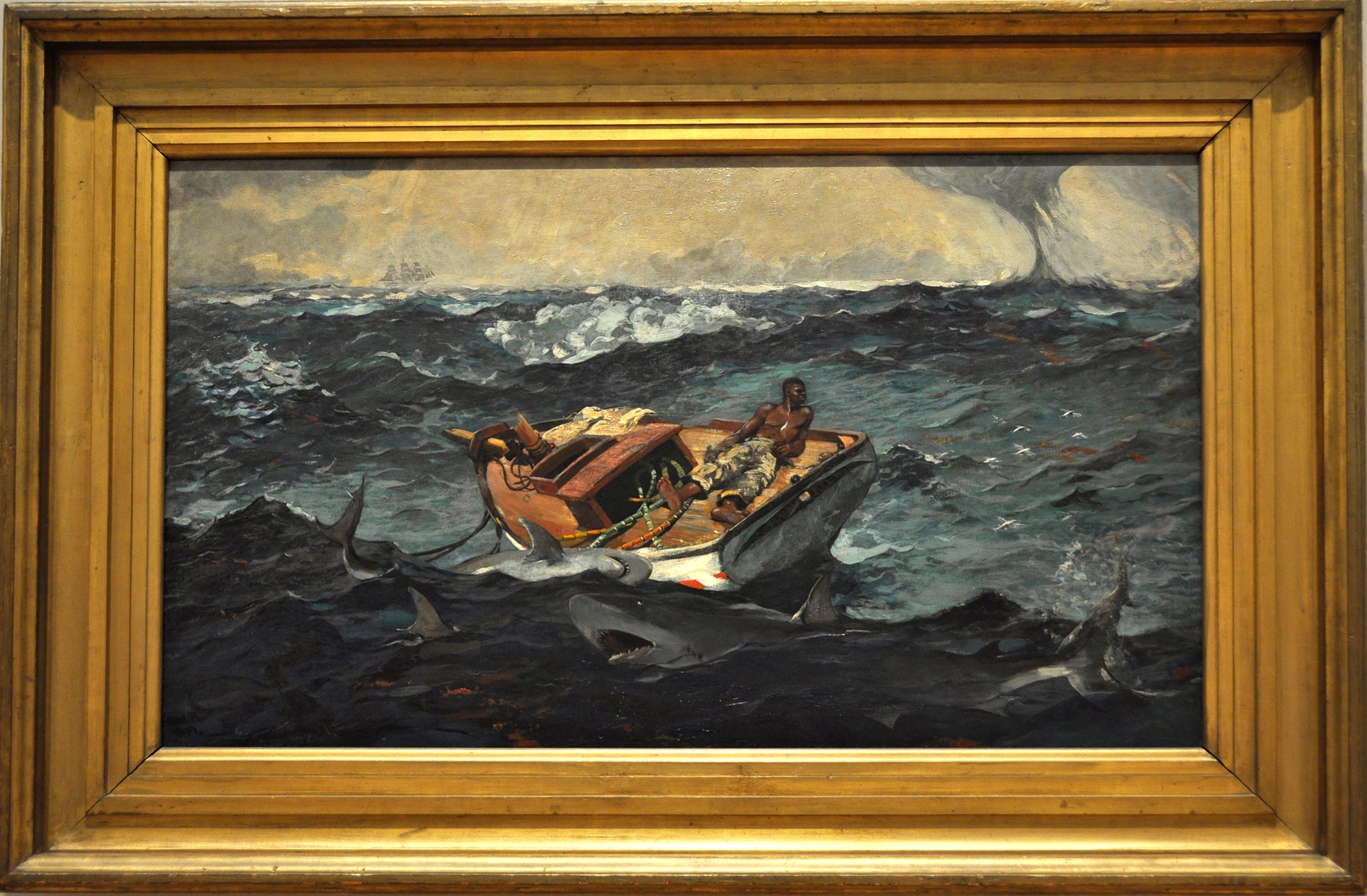 19世纪90年代,他曾有两次巴哈马的冬季之旅,由此创作了此画。狂暴的大海,险恶的鲨鱼,拼搏的渔夫,使人联想到《老人与海》。
