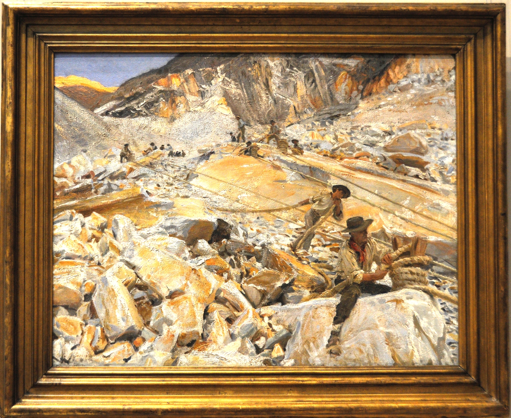 这是一个意大利历史悠久的大理石采石场。萨金特在现场研究了矿工在没有任何现代设备条件下的严酷的劳动和生存状态,他投入了巨大的热忱,彻底放弃了一切舒适的生活,与他同去的比他年轻得多的同伴受不了,没几天就逃走了,而萨金特在那里呆了好几个星期。