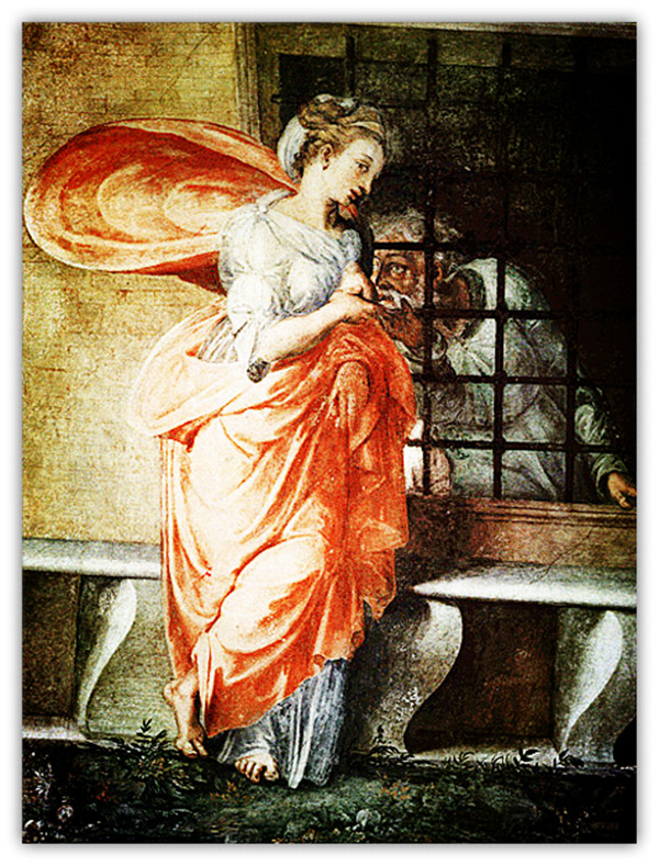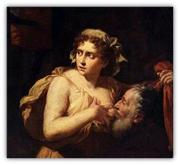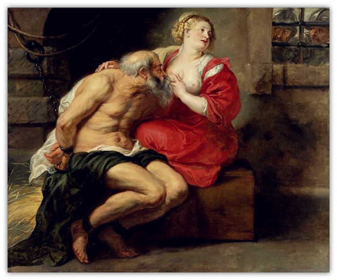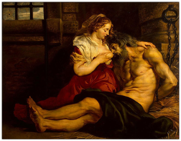 父亲西门被国王监禁在监狱里,被判"禁食"刑,就是让人慢慢的饥饿而死去,女儿来监狱探望父亲,看见父亲消瘦的躯体,于是每天用自己的奶水喂食父亲。