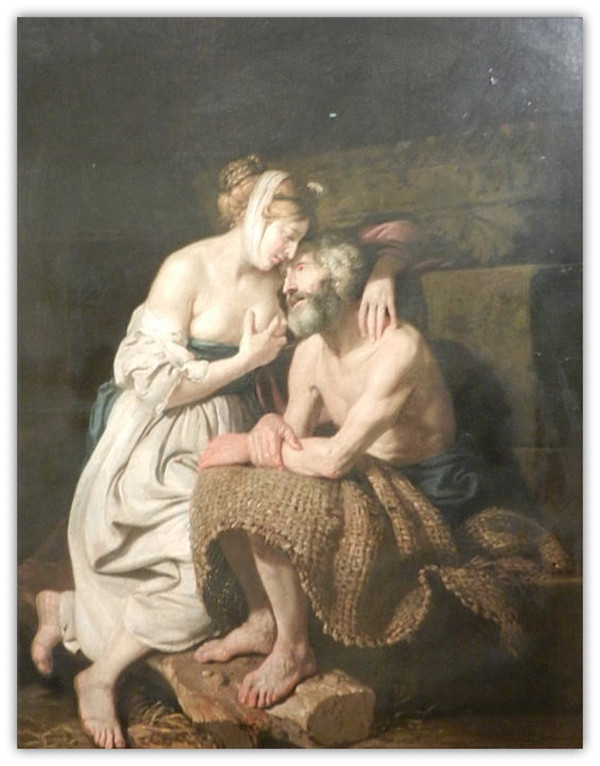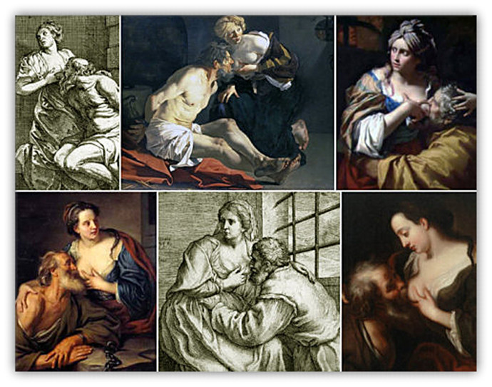 典故来自罗马的“孝行善举”,原始的故事讲述女儿到狱中去反哺母亲。文艺复兴的时候,将这个故事重新注释,吸吮乳汁者从母亲变成了父亲,让这个故事染上了乱轮的色彩。女儿的父亲被关押,不准吃饭,快要饿死了。女儿为救父亲,在看望父亲的时候喂奶给他吃,就这样把父亲从死亡线上救回来了。
