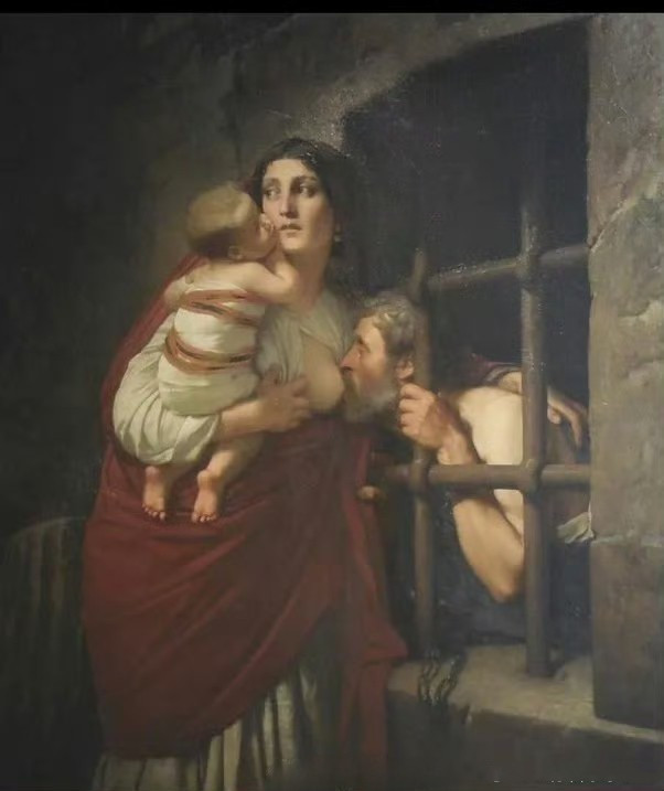 17世纪鲁本斯作品《西门与佩罗》,如今这幅画藏在波多黎各的国立美术博物馆内。画中两人是父女,父亲西门是位为独立而战的英雄,却被陷害判处“禁食”刑罚,女儿佩罗探望父亲,看到其消瘦的身体,便偷偷把乳汁给了自己父亲。