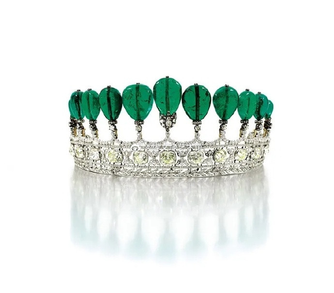 只要一提到“著名的祖母绿”,这顶王冠那必须要隆重登场。它是德国的古德·亨克尔·冯·杜内斯马克伯爵送给第二任妻子卡特丽娜的结婚礼物。1979年,这顶王冠被卡特丽娜的后人在苏富比拍卖,后来于2011年又现身苏富比,并以1270万美元的价格成交,高出估价两百多万,成为迄今为止拍卖会上最贵的王冠。