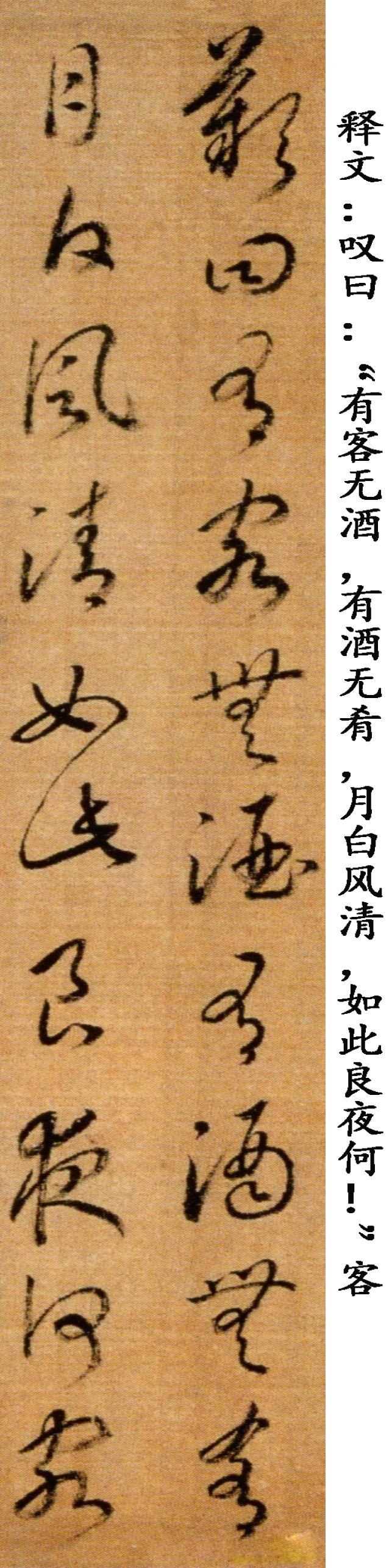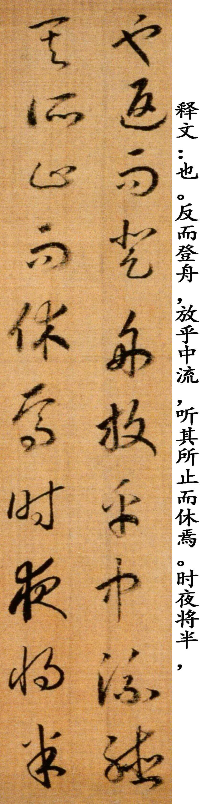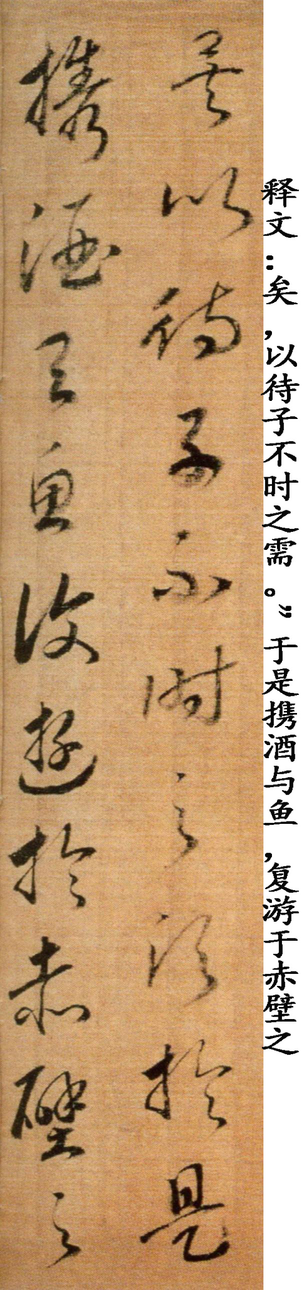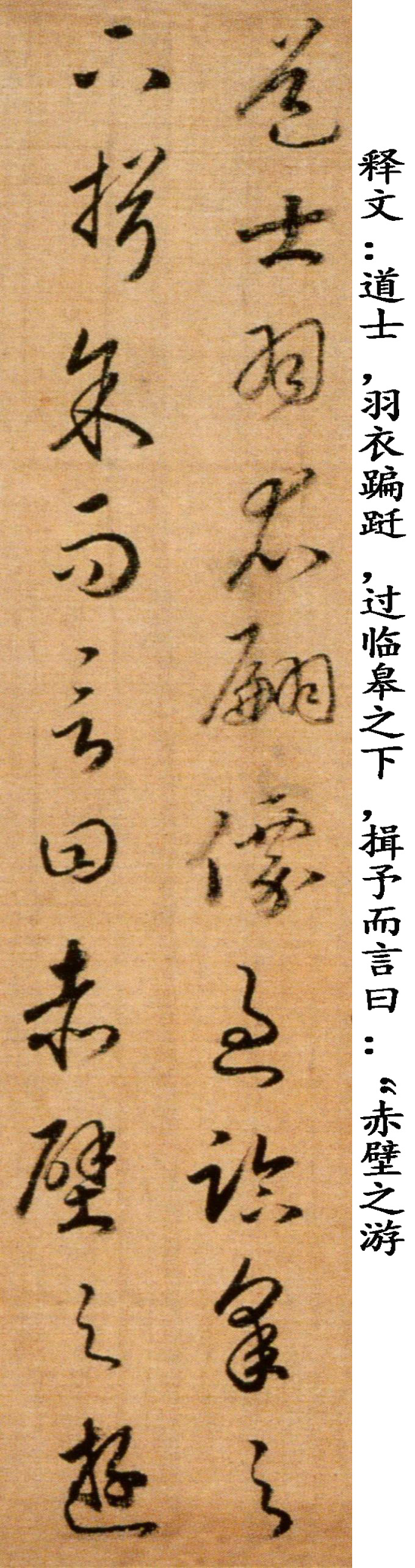 赵构《草书后赤壁赋卷》,绢本,纵29.5厘米,横143厘米(含画)。清宫旧藏。《后赤壁赋卷》同马和之画《后赤壁赋图》同装,笔法精熟,笔画稍显瘦峻,可见锋梭筋骨,功办极深。该段后接另纸无款篆书苏轼《后赤壁赋》全篇。鉴藏印记:梁清标、安仪周等藏印。历代著录:《南宋画院录》、《大观录》、《墨缘汇观续录》、《石渠宝笈续编》。