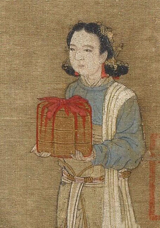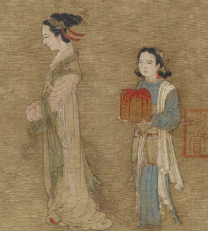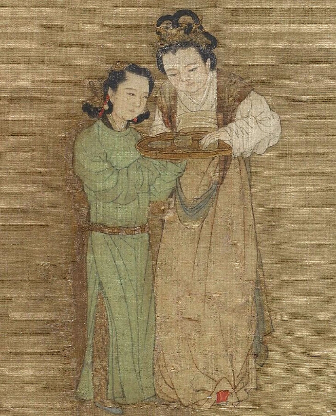 图页绘主仆四人,一侍女双手捧茶盘,一妇人伸手向盘中拿茶具。右边一贵妇面向她们而立,仪态端庄娴静,身着高贵,后随侍女双手捧一锦盒,典雅浓丽。画风承唐代周昉,旧题南唐周文矩,宋代茶道很是讲究。一场茶事下来,风炉、汤瓶、茶碾、茶罗、茶磨、茶筅、茶盏.....你方唱罢我登场,无不体现出宋人对饮茶仪式感的追求。
