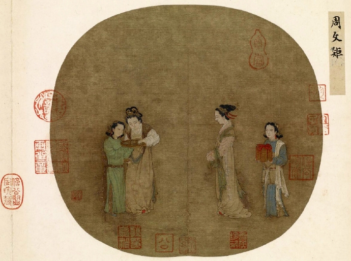 《饮茶图》传为五代南唐画家周文矩作品。图页绘主仆四人,一侍女双手捧茶盘,画中一贵妇正向一茶盘中取茶,作正面低头状,神情端注,一手伸向茶杯,一手从后面正欲伸出托住茶杯。一绿衣侍女双手托茶盘,小心翼翼,专心注视茶盘中茶。不远处一贵妇合扣双手于胸前,微微低头回向她们而立,仪态端庄,似正等待执茶妇人向其献茶,其后一侍女手托锦盒紧随其后。