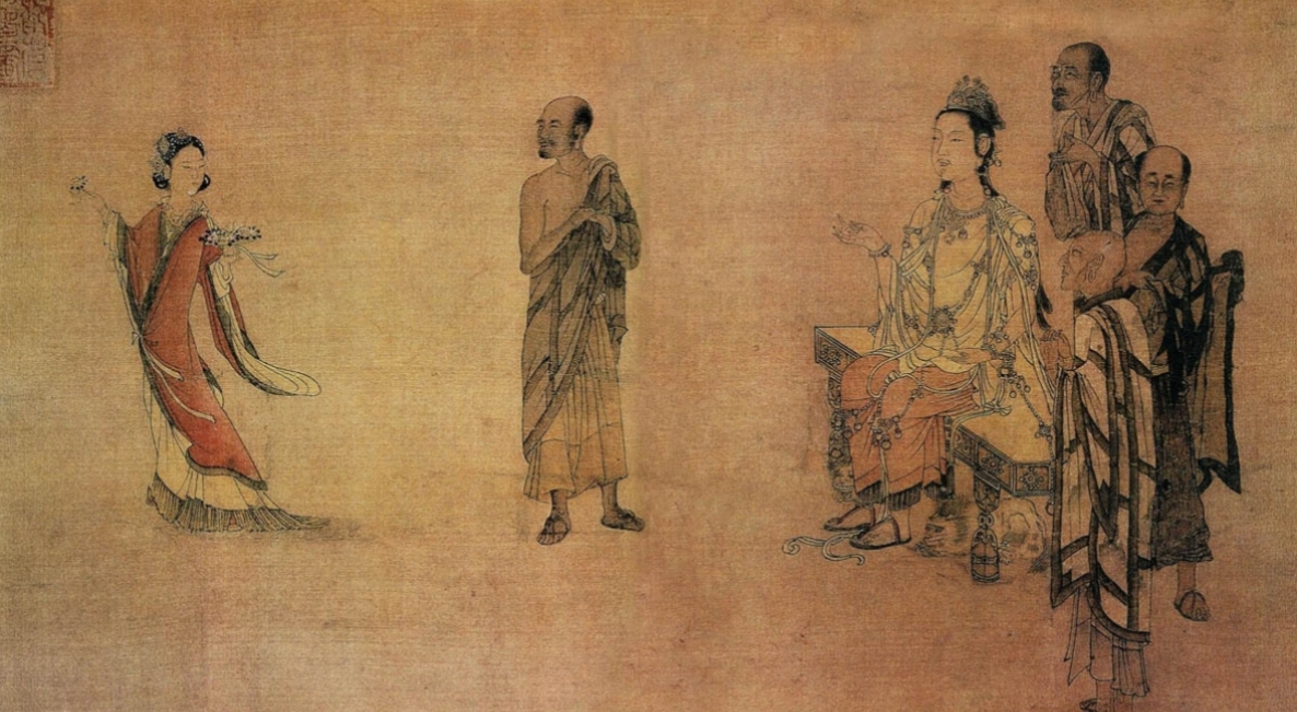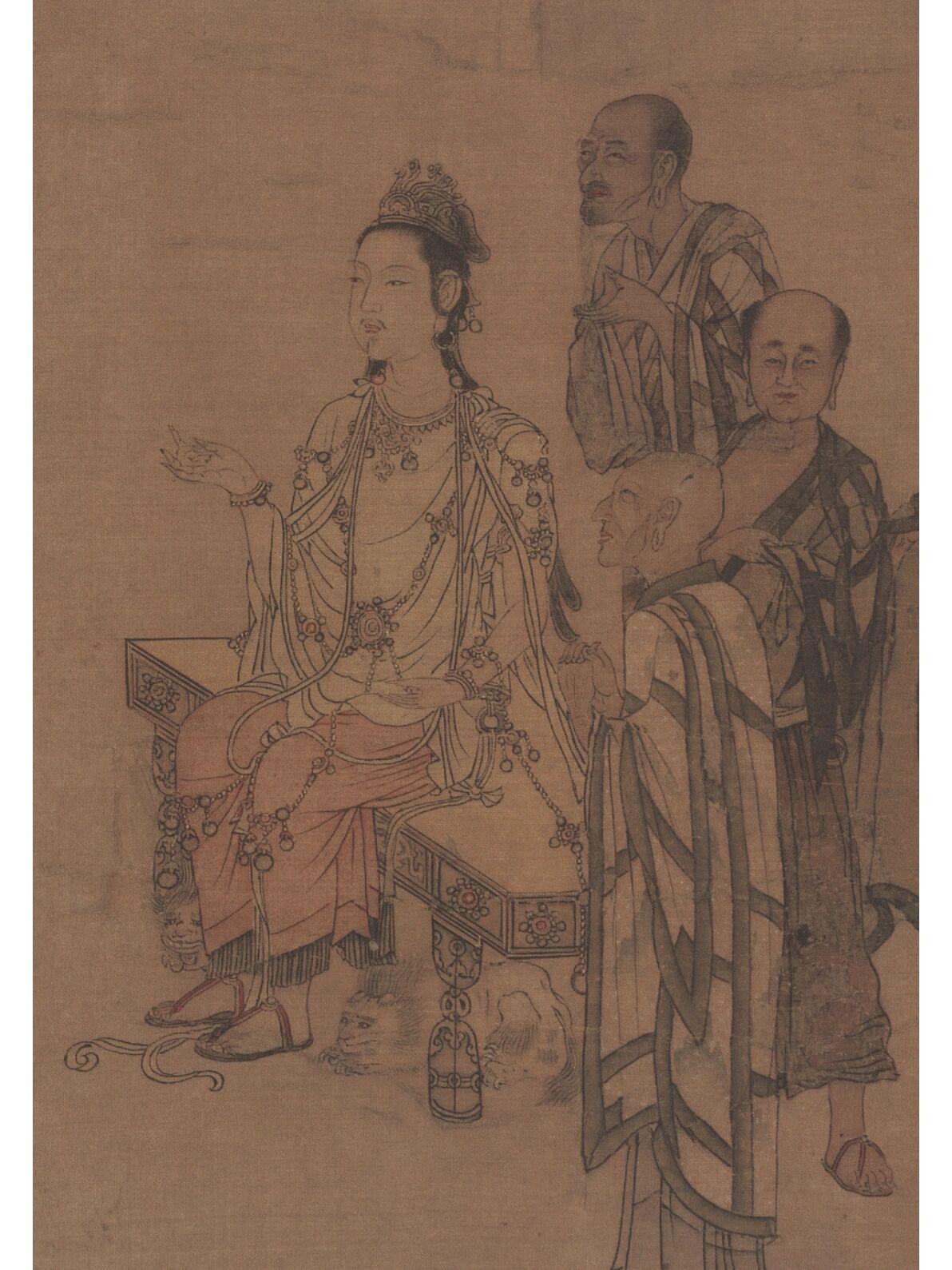 此画应该不是一个完整的版本,可能是《维摩经图卷》的一部分,画面右端为文殊菩萨与众比丘,左边是舍利弗与天女,再左边应该还有维摩诘的形像。
