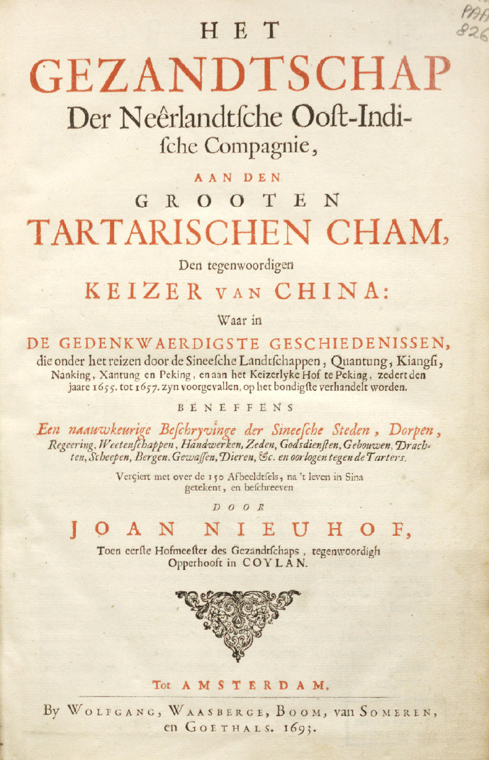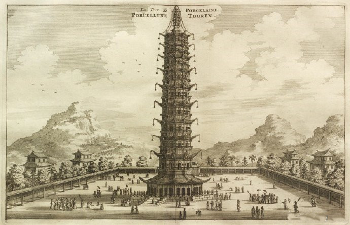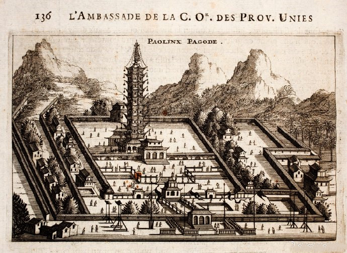荷兰旅行家、外交官约翰·纽霍夫(Johan Nieuhof,1618-1672)1665年出版的《荷使初访中国记》(An embassy from the East-India Company)一书中,关于南京大报恩寺琉璃塔的插图。纽霍夫1655-57年跟随荷兰东印度公司使团从广州一路到达北京觐见清朝顺治皇帝,商谈通商权。纽霍夫本人作为使团随行人员,留下了超过100幅关于中国的绘画,并收录于书中。这本书几乎是17世纪西方世界关于中国最可靠的资料(虽然也做了一些修饰美化,图3为封面),对后来欧洲的“中国风”有不小的影响。