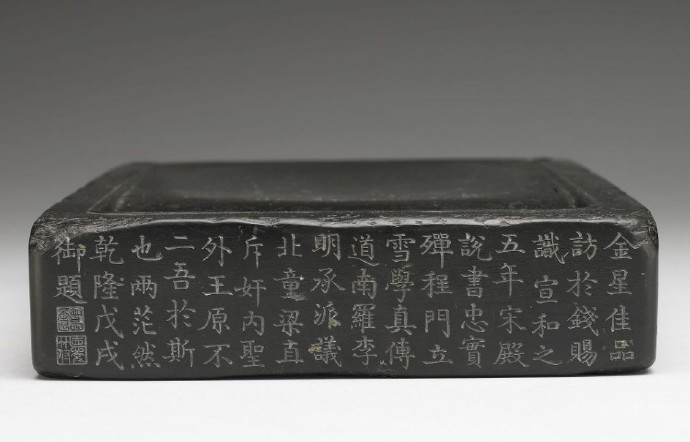 砚背镌篆书铭︰「宣和五年五月五日,帝召迩英殿说书赐此砚,其后子孙世守之。杨时识。」上端侧刻乾隆四十三年( 1778)楷铭︰「金星佳品访于钱,赐识宣和之五年。宋殿说书忠实殚,程门立雪学真传。道南罗李明承派,议北童梁直斥奸。内圣外王原不二,吾于斯也两茫然。乾隆戊戌御题。」