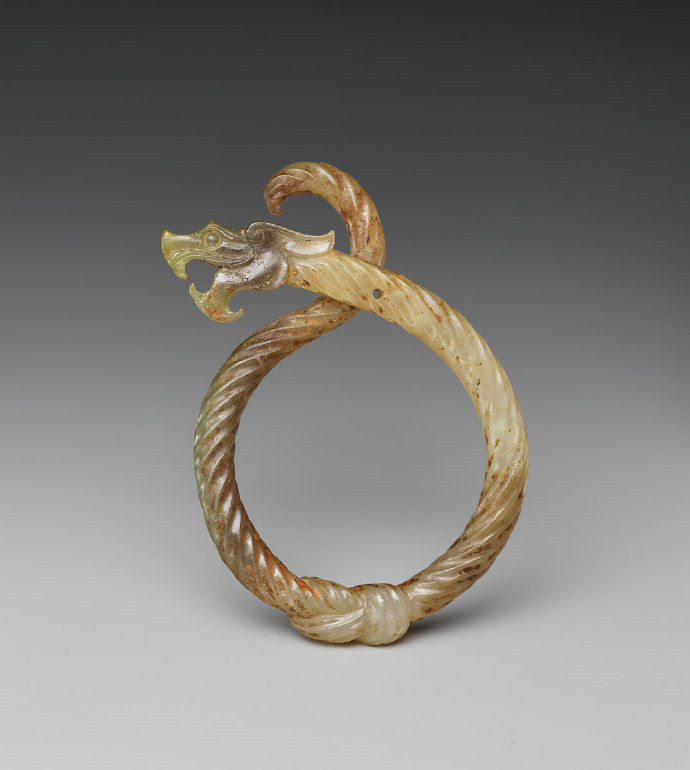 这件精美的绞丝龙形玉佩,其历史可追溯至公元前3世纪。该饰品呈龙形,身体蜿蜒曲折,雕刻有模仿扭绳的凹槽,展现出流畅优雅的曲线。这些精致的曲线展现了中国古代玉雕师超凡的才能与技巧,他们能够让坚硬难雕的玉石变得仿佛柔韧可塑,尽显工艺之美。