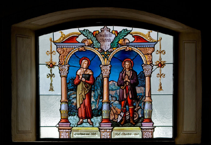 奥地利纳瑟尔文勒堂区教堂中的彩色玻璃画,展现了西班牙圣徒“农民”伊西多尔( Isidore the Farmer )与他的妻子玛丽亚·托里比亚。