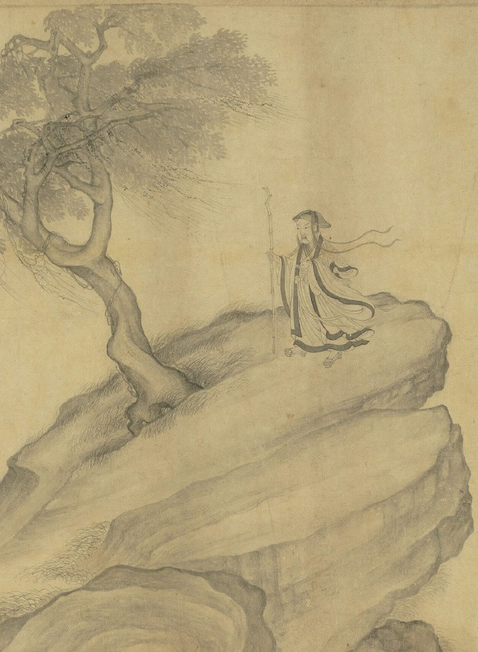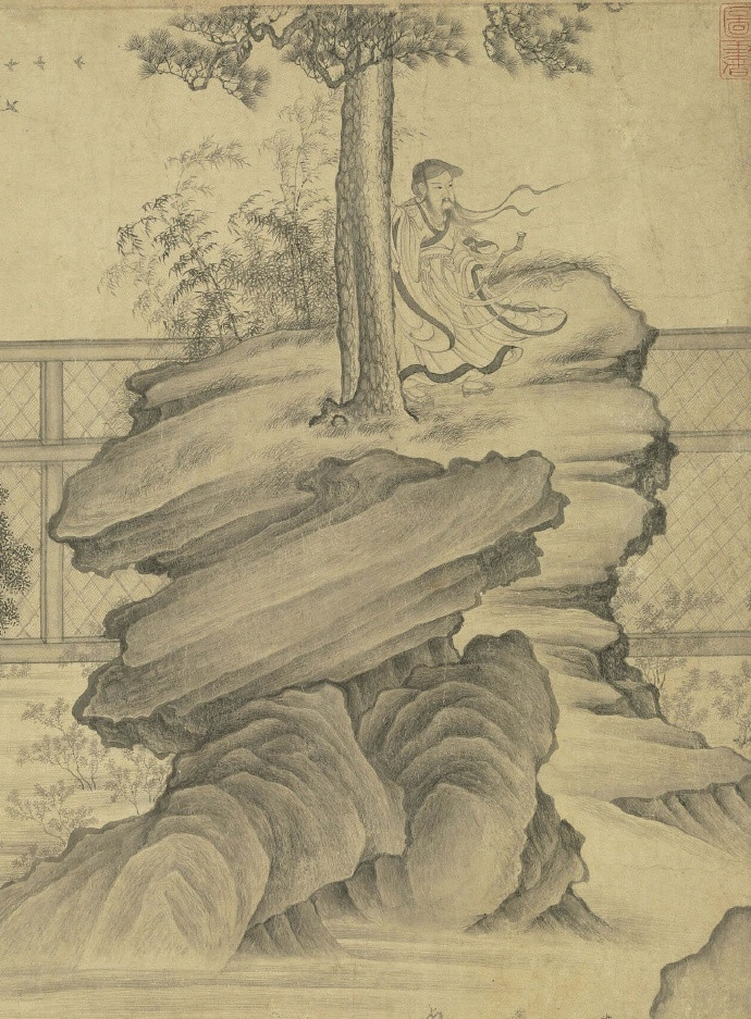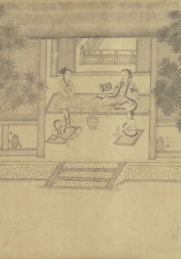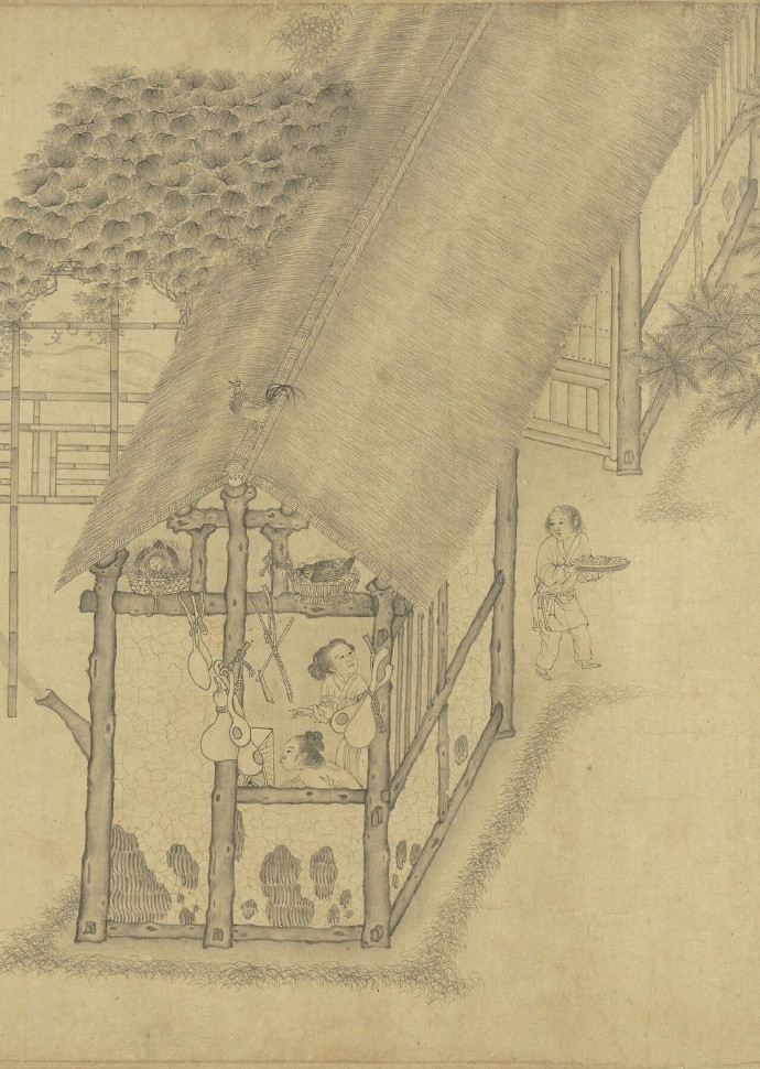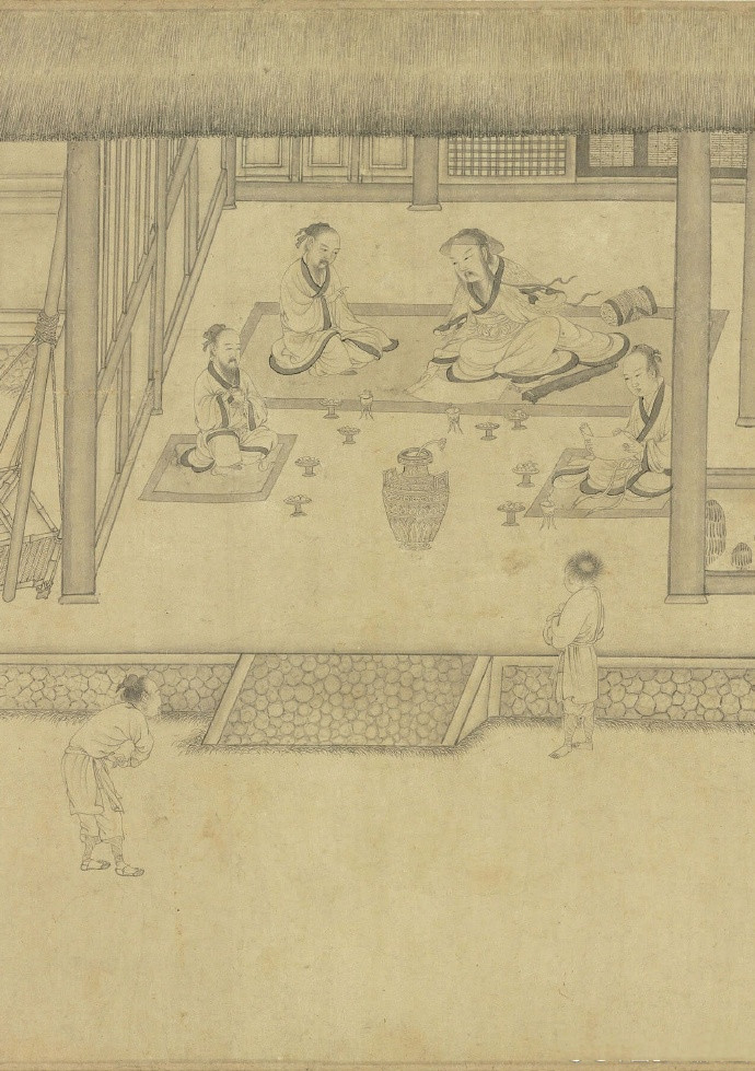 北宋 李公麟(传)《画归去来辞》 卷,纸本,水墨,34×898.8cm,台北故宫博物院藏。 此卷多半托名于北宋著名文人画家李公麟,实为苏州片伪古书画作坊的作品。苏州片伪古书画作品中除了青绿重彩一类以外,尚有许多纯用墨色绘写的白描作品,此卷即为一例。该画依据〈归去来辞〉内容,陶渊明在画卷中登场了十次,或乘舟而归,或抚孤松而盘桓,或植杖而耘耔,或临清流而赋诗……。诗赋中未加详述的部分,如破败开裂的壁面、缚系屋架上的鸡窝、满布花纹的青铜酒器等,在画中皆有细腻交代。