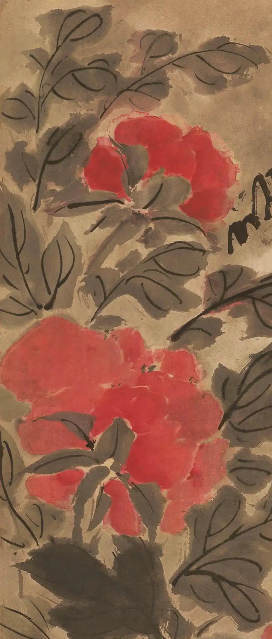 此图绘数珠红、白牡丹于山石前,布满全幅,最后还用石青衬底。牡丹敷以淡粉,用重粉点染边缘,显得晶莹剔透、庄重典雅。整个画面热烈为而秀雅,韵味十足。看似凌乱,实则秩序井然,似乎是信手拈来,流露出自然之趣。牡丹以水墨钩花点叶,花瓣赋彩,不求艳丽,却见笔墨功夫。山石用乱点皴,均脱去常套,对花写貌天趣横生,表现出作者高超的绘画技巧。