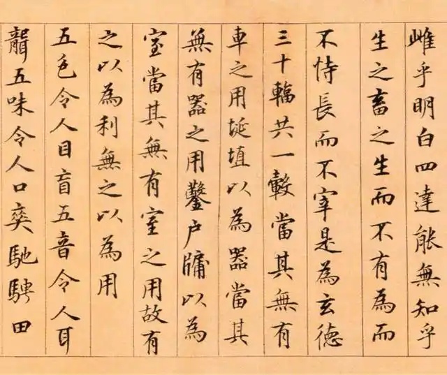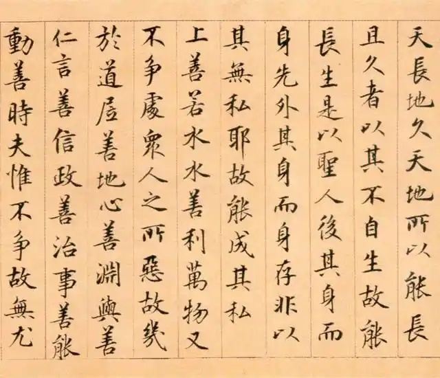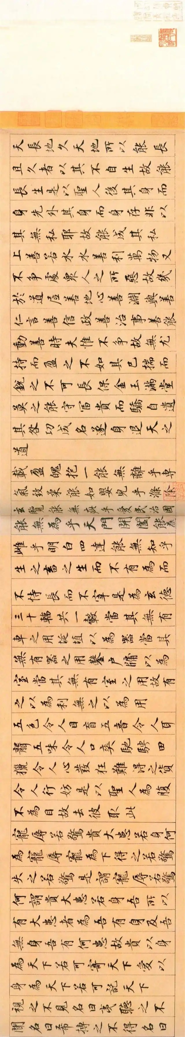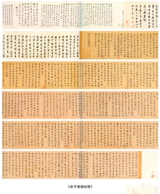 鲜于枢《楷书老子道德经卷》纸本,纵26.7厘米 横642.5厘米,北京故宫博物院藏。此卷学虞世南,体势修长,笔法精美,清爽劲利,是伯几仅见的楷书长篇,当为中年时佳作。此帖从“天长地久”开始,末书“老子道德经卷上”,缺下卷,不具名款。每段接纸有“三教弟子”朱文印。卷后有翁方纲题跋、吴荣光题名、颜世清跋共五段,又“松下清斋”书签。《道德经》文本以哲学意义之“道德”为纲宗,论述修身、治国、用兵、养生之道,而多以政治为旨归,乃所谓“内圣外王”之学,文意深奥,包涵广博,被誉为万经之王。